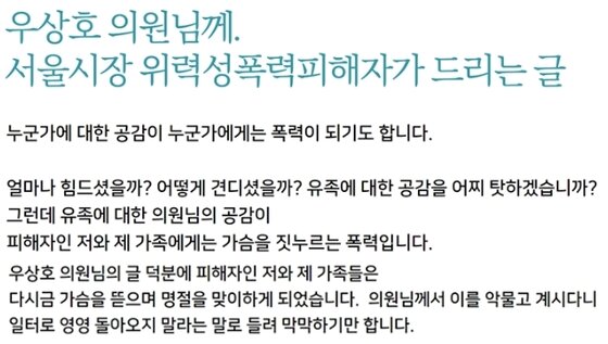 우상호 박 시장 소식에 큰 충격…여당 내부 황망한 분위기 우상호. 우 의원은 오늘 자신의 sns를 통해 언론에 보도된 박 전 시장의 부인 강난희 여사의 손 편지글을 봤다며 이렇게 밝혔습니다.
